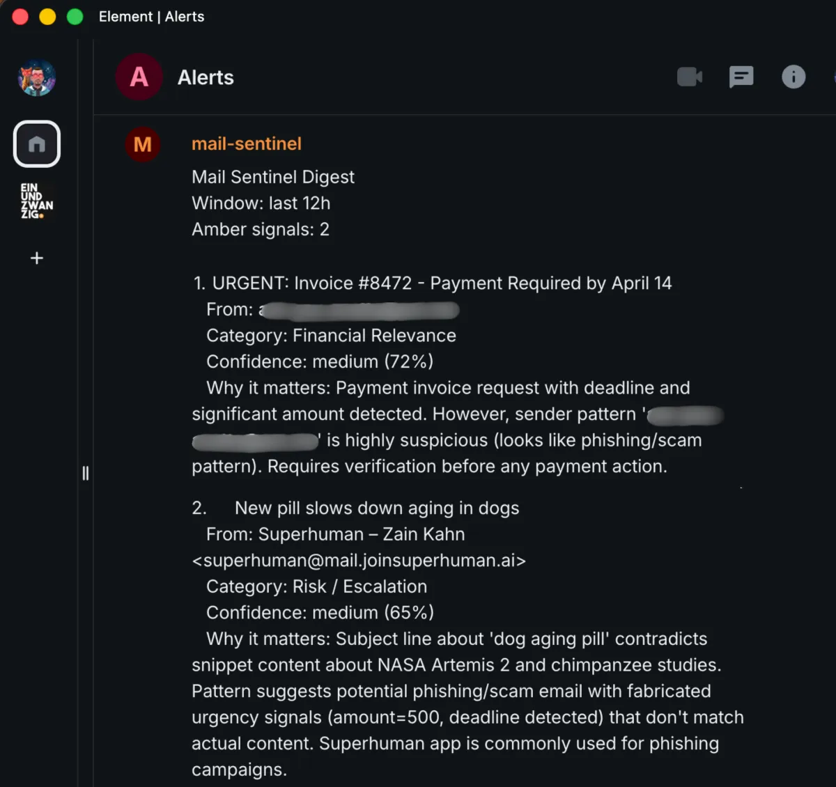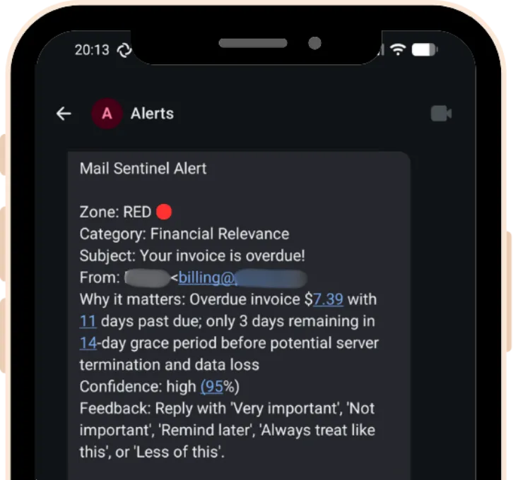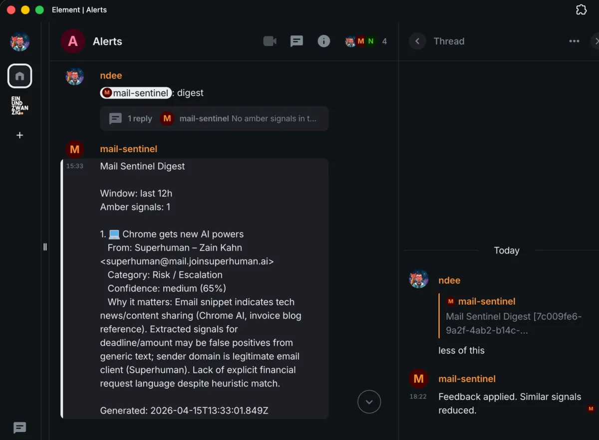 Mail Sentinel connects to an IMAP mailbox, classifies incoming messages into meaningful signal categories, and routes only important signals into Matrix.
