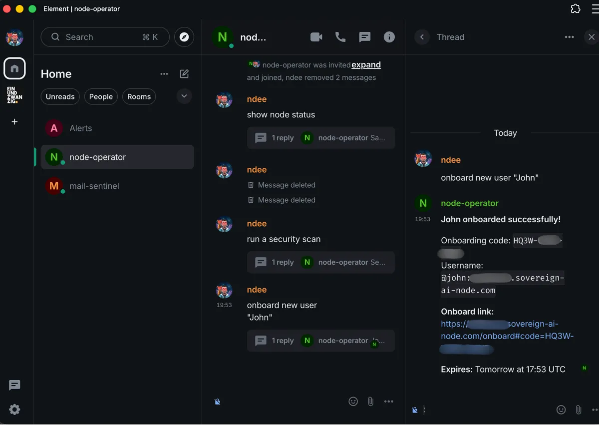 Sovereign AI Node is a small self-hosted AI control plane for specialized bots. Matrix acts as the operator-facing control layer, so commands, signals, and coordination stay inside infrastructure you control.